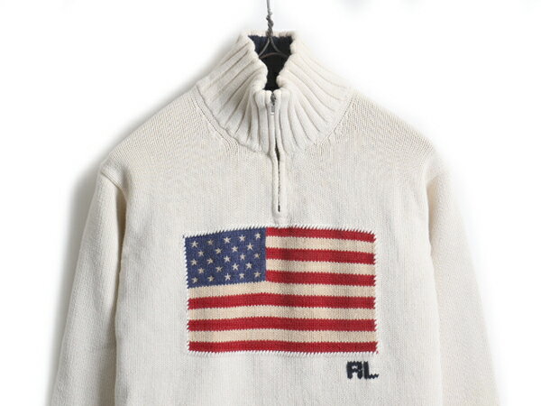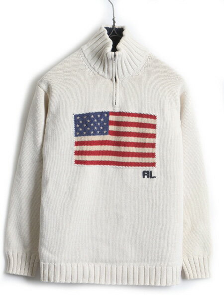 【27日ポイントアップ7倍!!】 ボーイズ L 160cm 程■ POLO ポロ ラルフローレン 星条旗 ジップ ハイネック 長袖 コットン ニット セーター ( キッズ ) 古着 ナチュラル| 中古 RALPH LAUREN プルオーバー 長袖ニット 長袖セーター コットンセーター ニットセーター アイボリ