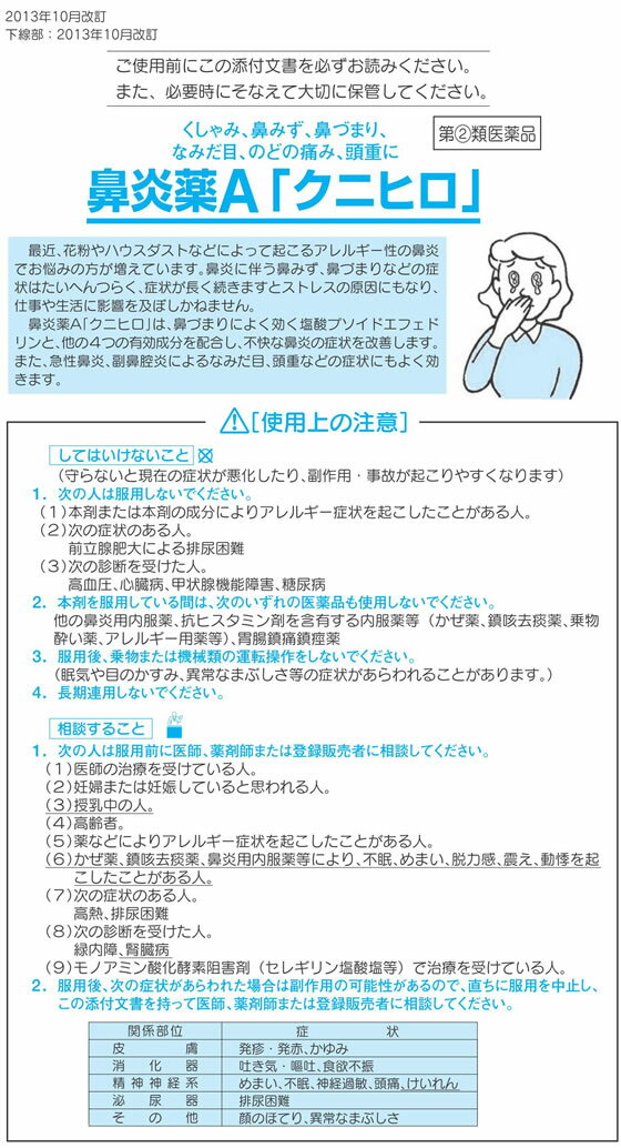 鼻炎薬A「クニヒロ」は、鼻づまりによく効く塩酸プソイドエフェドリンと、他の4つの有効成分を配合し、不快な鼻炎の症状を改善します。