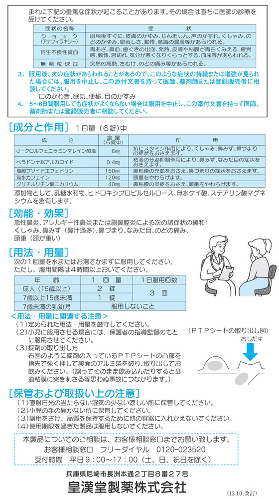 医薬品販売に関する記載事項(必須記載事項)は こちら【発売元、製造元、輸入元又は販売元】製造販売元:皇漢堂製薬株式会社住所:兵庫県尼崎市長洲本通2丁目8番27号電話:0120-023520【商品区分・生産国】指定第2類医薬品・日本製【広告文責】フォーレスト株式会社0120-40-4016鈴木 ちはる(登録販売者) 2019kfiy【商品説明】最近、花粉やハウスダストなどによって起こるアレルギー性の鼻炎でお悩みの方が増えています。
